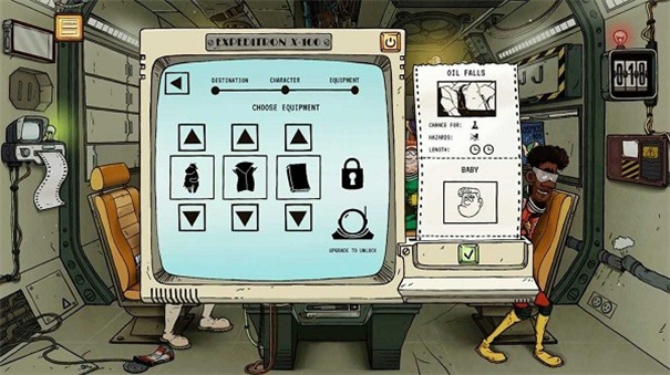 1、颓废卡通画风搭配贴合场景的BGM和音效,共同营造荒诞又紧张的太空生存氛围。