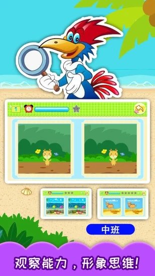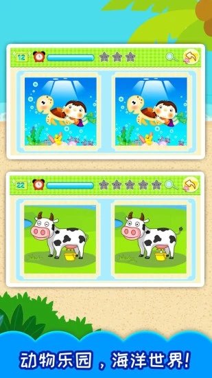 1、专门为儿童认知特点设计的找茬游戏,包含海洋世界、动物乐园等深受孩子喜爱的主题场景和形象元素。