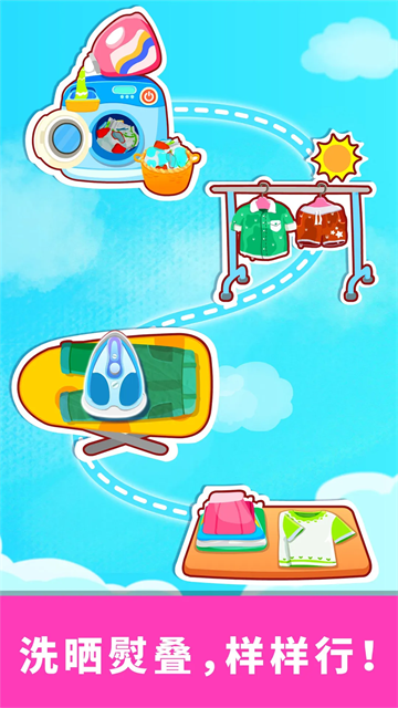 启动开关,小小洗衣机转呀转,衣服马上就洗好!和妈妈一起晒衣服、熨衣服、叠衣服吧!