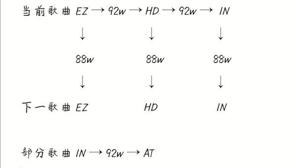 一种是把当前难度达到92w后开启下一难度,另一种是把上一首歌的对应难度达到88w后开启下一歌曲的对应难度,通俗点来说就是下图这样。