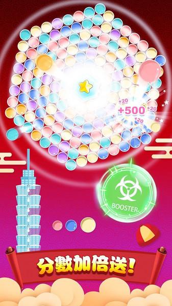 2、其实这款游戏与我们知道的消消乐玩法是有相似之处的,击破三个或三个以上颜色相同的泡泡即可。