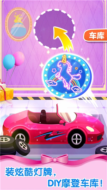 3. 工具墙搭配霓虹灯箱与动感音响,打造炫酷车库,成就公主满意的创意城堡。