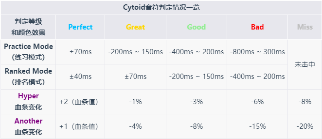 Hyper/Another:在游戏中追加血条,Another血条比Hyper血条难度更高。初始血条值为谱面难度×75(15+难度的谱面按16计算;下述的Rating模式中亦如此),变化规则可参照上表。