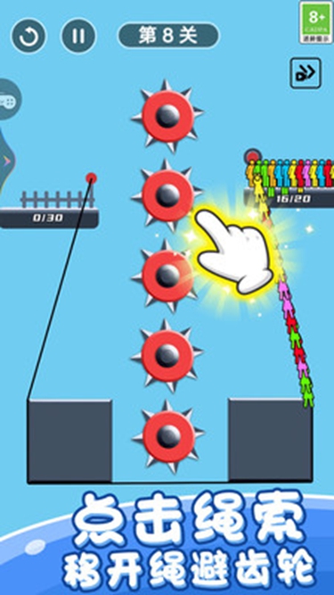 2、仔细观察每个关卡的地形障碍与机关分布,确保小人能够全部沿着绳子安全下落。