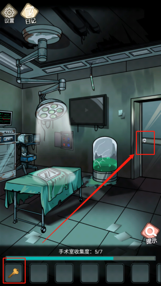 4、点击前面的门,安上把手,玩游戏开门(目前好像只能看广告开),捡起门下面的红色密码牌。这个场景就结束了,可以转换场景了,但它下面的收集显示差一个,这个就要你点下方的日记本并且看日记(看广告,点日记中间看广告,不是观察的广告)