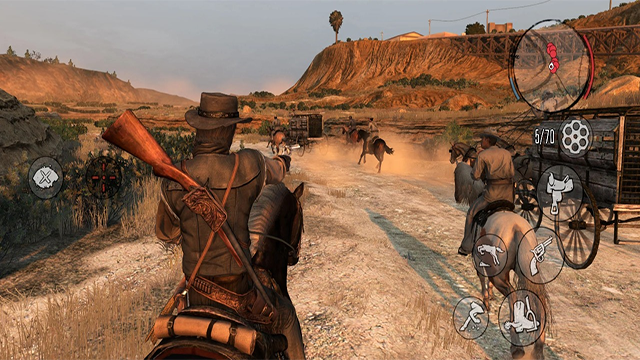 荒野大镖客救赎这款游戏从电脑端移植过来,让安卓手机玩家们也能够体验gta大奖的最终获得者玩法,充满神秘的地带,不仅有着民风淳朴的村民,也有四处作乱的亡命之徒,游戏的自由度十分高,开启专属的死神之眼对罪恶之人展开猎杀,还有路途中的野兽更是可以为你带来食物以及可以贩卖的皮毛,游戏操作难度不复杂,十分考验玩家们的心性,一段旅途和人生从你下载荒野大镖客救赎这款游戏开始。