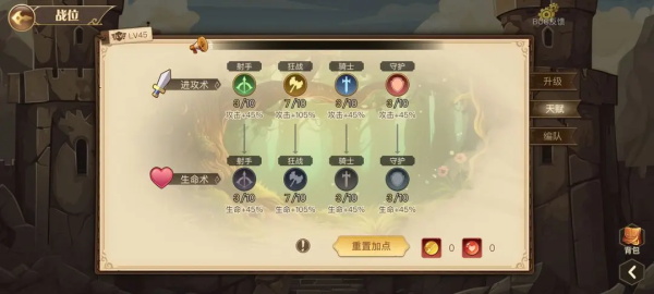 友友们通过升级获得的进攻点和生命点消耗,可以对应的给不同的职业进行天赋加点。(规则说明如上图所见)