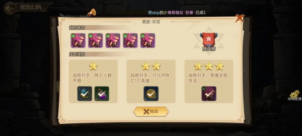 通过完成主线我们可以开启相应的黑誓幻阵的地图关卡,完成关卡的星级挑战可以获得相应的挑战奖励,奖励包括有装备,战队经验,绑定币,英雄卡牌。