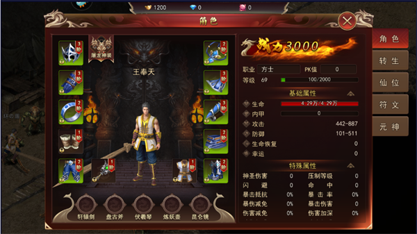 装备大体上可以分为普通装备、橙色神装和额外的红色传奇套装。普通装备作为过渡装备,这些装备在击杀BOSS的过程当中也是很容易掉落的。多余的普通装备可以通过回收获得强化石、金币。而橙装则是终极追求目标。橙装备有着十分强大的属性加成,同时掉率随着转生等级的提升,获取也更为困难。
