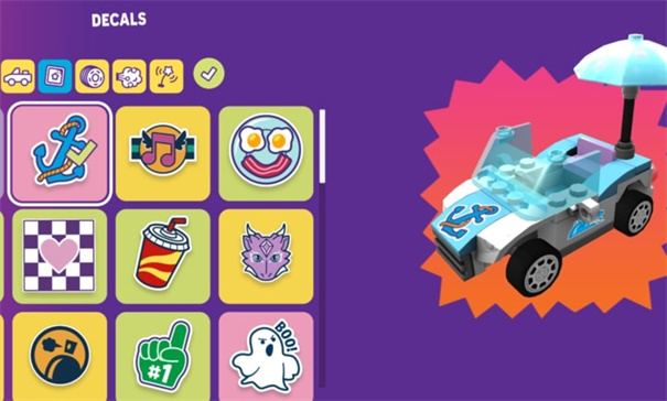 1、解锁数十款乐高载具,自由调整颜色、贴纸与性能部件,打造专属座驾。