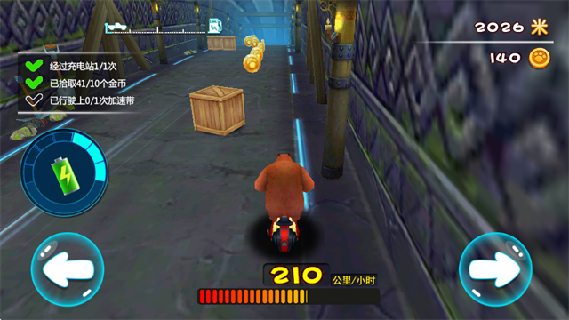 2、玩家通过左右按钮移动赛车变道行驶躲避障碍、完成任务、获取金币奖励等。