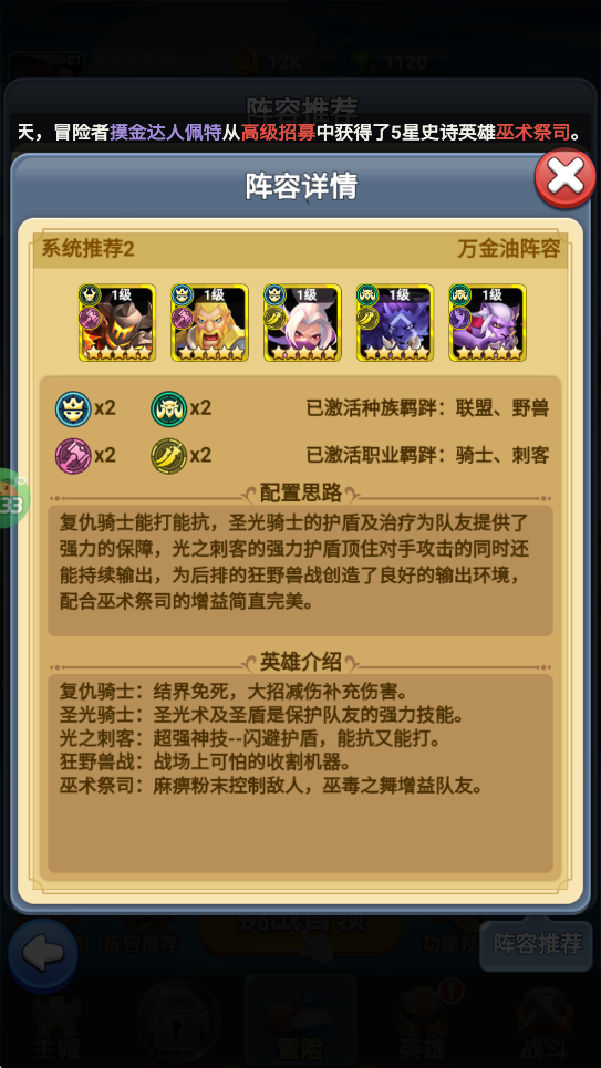 阵容组成:复仇骑士+圣光骑士+光之刺客+狂野兽战+巫术祭司