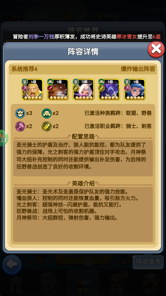 阵容组成:圣光骑士+嗜血狼人+光之刺客+狂野兽战+月神祭司