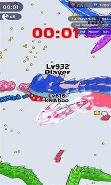 3.吞噬食物和对手后,蛇身会变长,右上角会实时显示当前排名,激励玩家不断提升名次。