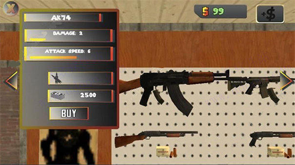 6、每种武器我们可以看到名称、伤害、攻击速度,子弹,价格,比如说AK74需要2500美金。