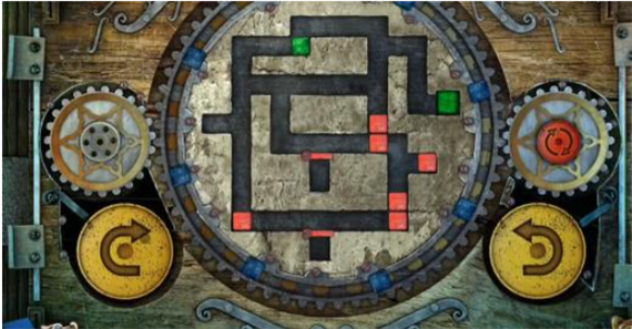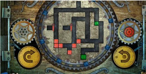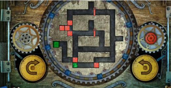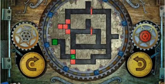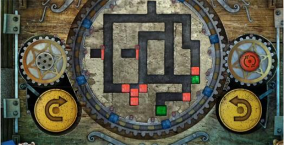 17、最后,点击左边黄色的旋转按钮一下,中间的大齿轮会顺时针旋转一次,旋转后的立方体位置如图,此时的绿色立方体已经进入了绿色的单元格内,即可通关,门就打开了。