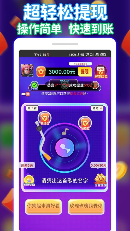 2、根据序幕进行猜歌答题,答对闯关就能收取红包,每日应战趣味多多。