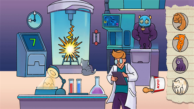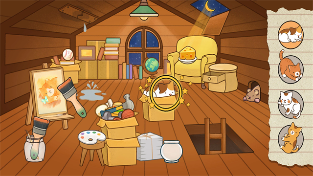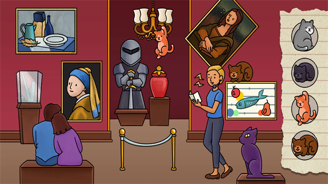 喵侦探咪雅是一款休闲的寻物游戏,玩家需要找到隐藏在画面中的所有猫咪和一些特定的物品,玩法比较简单,不过有些猫咪或者物品隐藏得比较巧妙,需要你绞尽脑汁解开各种谜题才能救出动物,有时甚至需要将手机颠倒才能好找到想要的物品,眼前所看到的不一定是真相,在柜子甚至人物后面有可能会藏匿一只你找不到的小猫猫哦。