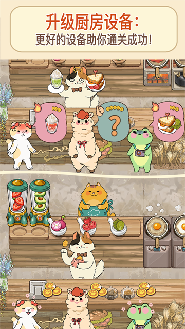 1、卡通猫咪世界的美食经营,你将扮演厨师,开启你的美食店铺。