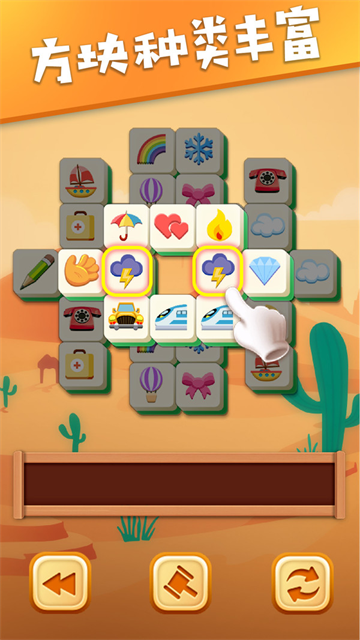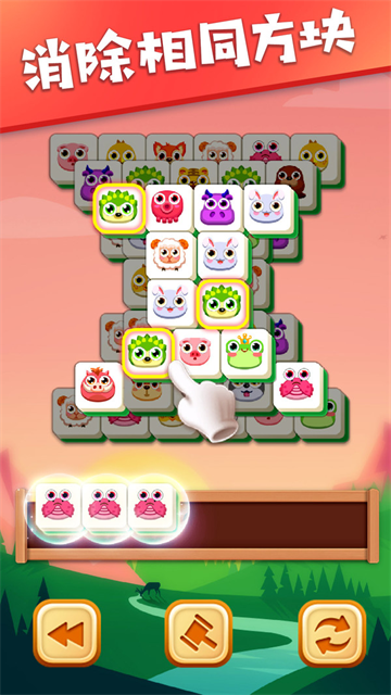 2、玩法:只需点按即可将方块放入堆槽中。三个相同的方块(例如三个草莓)即可匹配消除。
