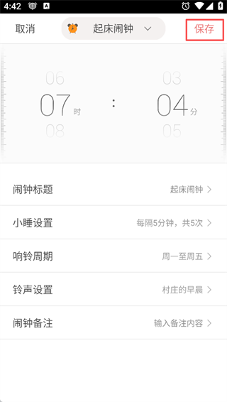 3、设置闹钟时间、标题、重复周期等信息,点击右上角【保存】