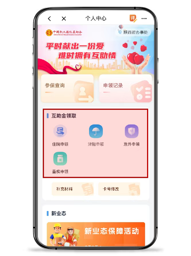 1、登录软件之后,点击首页“职工互助”图标后,点击“陕西“图标;