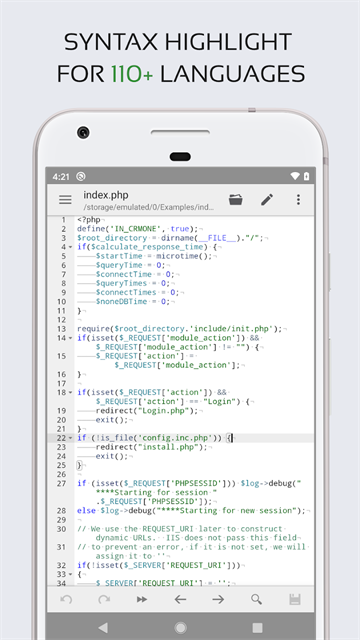 代码编辑器这款软件专门为广大安卓用户们设计出来的,以精心调教的各种代码框架来节省用户们的时间,不管是在工作中还是生活之余都可以将你当下所运用到的算法和逻辑都进行编写,简洁有力且美观的代码行成为你的标准,支持多种语言编写程序,自动根据你当前所在的国家来改写,有需要的小伙伴们快来下载代码编辑器试试吧,所有功能全部免费还没有广告,省心省力值得信赖。