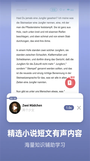 含德语阅读听力内容,每篇配音频,短文、新闻等内容,并提供每日更新,点击即可学习