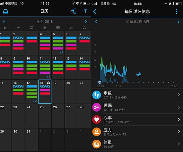 3、在【日历】菜单,以日历的形式整合每个月的运动数据,点击日历上的某一天,可以查看当日具体运动数据。