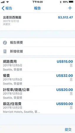 告别纸本收据和电子试算表。 SAP Concur 提供自动化、数位的费用管理,所以员工可以使用行动装置提交和追踪费用申报。