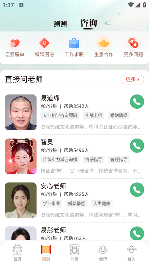 支持文字、语音、视频多种咨询方式;众多专业情感达人1对1在线为你解答恋爱、婚姻、人际关系的困惑;