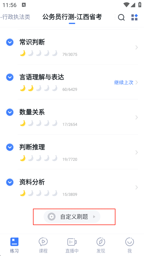 1、打开粉笔APP,点击首页底部的【练习】或直接选择【自定义刷题】入口;