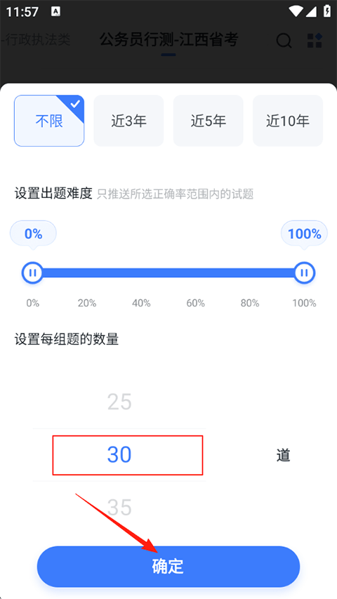 3、找到【设置每组题的数量】选项,点击数字按钮(如15道、25道、30道等)进行选择,确认题量后点击【确定】按钮,系统将按新题量生成题目。
