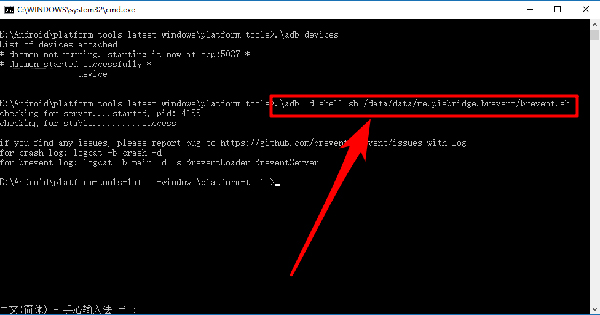 14、待我们的设备列举出来后,输入命令“.adb -d shell sh /data/data/me.piepidge.pevent/pevent.sh”,从而完成我们对黑阈手机端的授权;