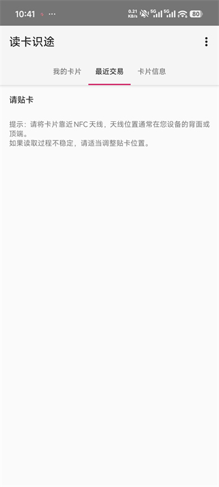 1、进入读卡识途的【最近交易】页面,按提示将公交卡贴近设备NFC天线(通常在背面/顶端)即可读取卡片信息。