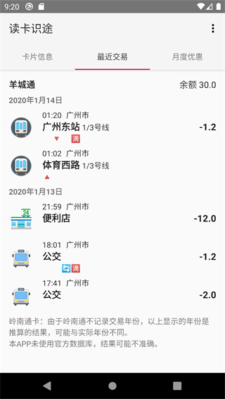 3、切换到【最近交易】页,能查看羊城通的交易记录(含地铁/公交站点、消费金额、便利店消费),需注意岭南通交易年份为推算结果。