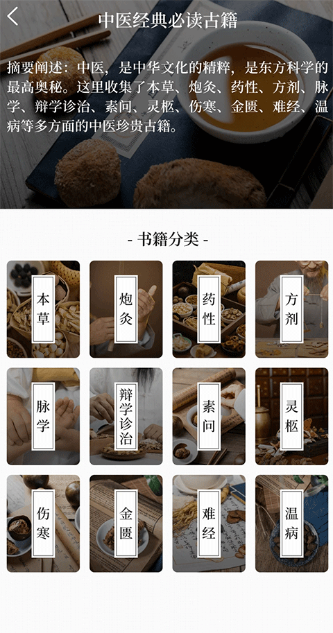 如果你对中医感兴趣,如果你是中医行业的从业人员,那中医养生古籍App这个软件一定要下载,这是款融合了海内外中医孤本的阅读软件,涵盖了养生、经络、妇科、外科、针灸、风虚劳损等多种疗法的详细介绍,在这里可以看到名家医案,医学估计,以及老中医经验之作,等多种中医书籍,为用户们提供了精准高效的古籍阅读内容,精简了晦涩难懂的古文,让用户们能更好了解中医传承中医知识,想学习中医的用户快来下载中医养生古籍App吧。