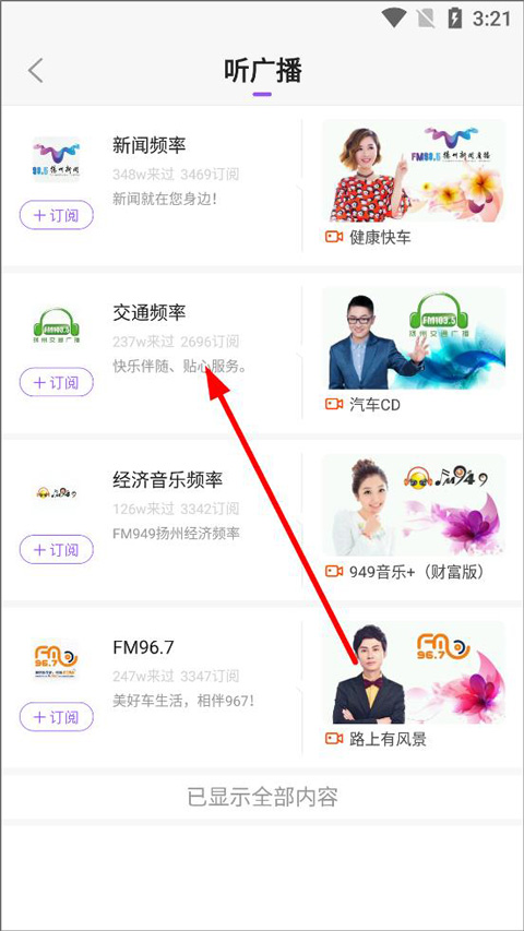 2、进入听广播页面,有新闻频率、交通频率、经济音乐频率等,用户选择自己需要收听的广播;