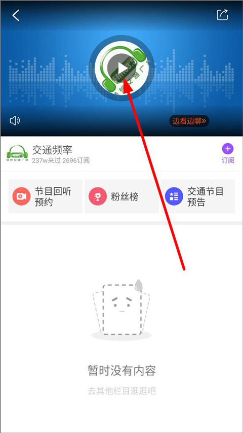 3、打开广播收听页面,用户可订阅广播、节目回听预约、查看粉丝榜和节目预告,点击播放键即可收听广播。