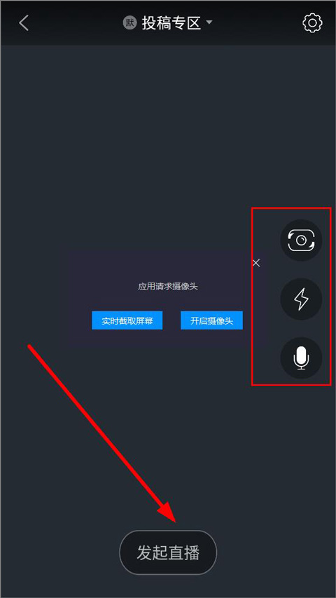 2、开启摄像头,用户可设置镜头、闪光灯和语音,点击发起直播;