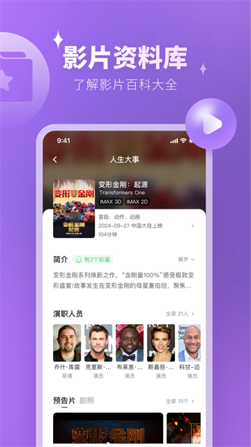 3. 影片详情页聚合预告片、剧照、评分等信息,方便快速了解影片内容。