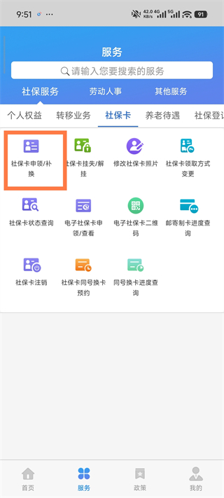 1、如需申领/补换社保卡,请打开“天津人力社保手机APP”,进入“服务”菜单,选择社保卡页面,点击“社保卡申领/补换”功能。