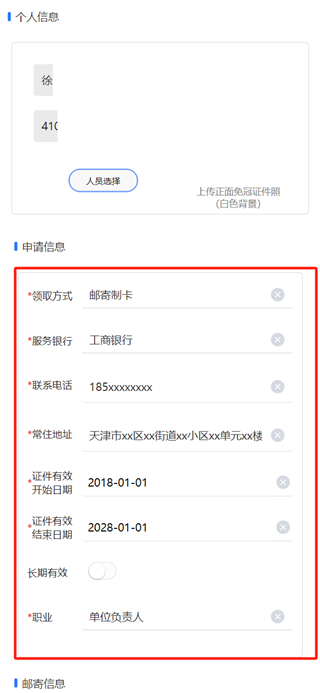 (2)上传图片时,包括个人头像,身份证正反面(邮寄制卡需传),图片大小建议在5k-200k之间,若超过200k,系统会自动压缩;上传图片格式为jpg或jpeg。