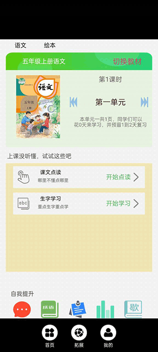 1、五年级语文上册_所有课文、词语的真人朗读:可跟读、可点读,还可随意组合连读;