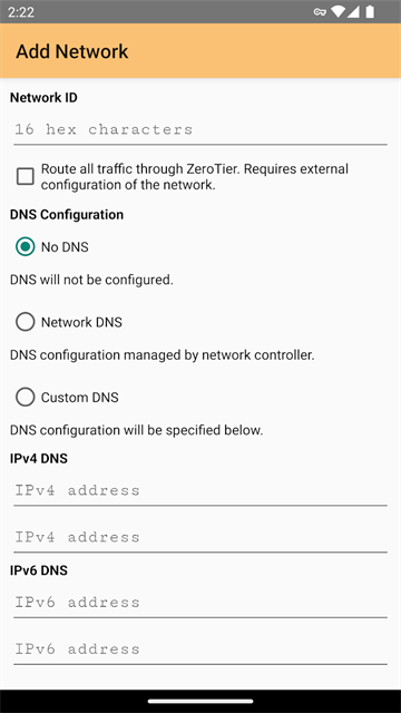 4、填入你的zerotier的16位ID,点add network即可,下面有其它选项的不动。