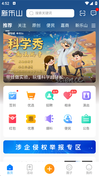 集合签到、优选、招聘、 相亲 、演出等多元服务入口,还有红包、优惠、爆料、便民、公告等功能,同时推送本地活动资讯,是综合服务与资讯获取的核心入口。