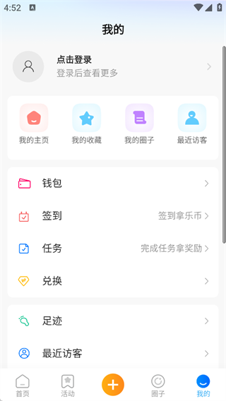 个人中心,包含我的主页、我的收藏、我的圈子、最近访客等功能,还有钱包、签到、任务、兑换、足迹等服务,方便用户管理个人账号和参与平台互动。