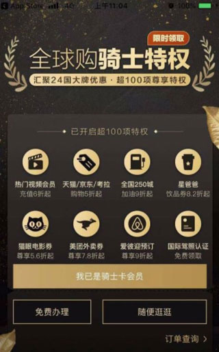 全球购骑士特权目前已接入优质的全球尊享特权,其中包括了热门视频会员充值6折起、全国62城 加油 9折起、全国贵宾厅9.9元体验、网易考拉购物4%返现等,将会陆续接入更多独家特权。