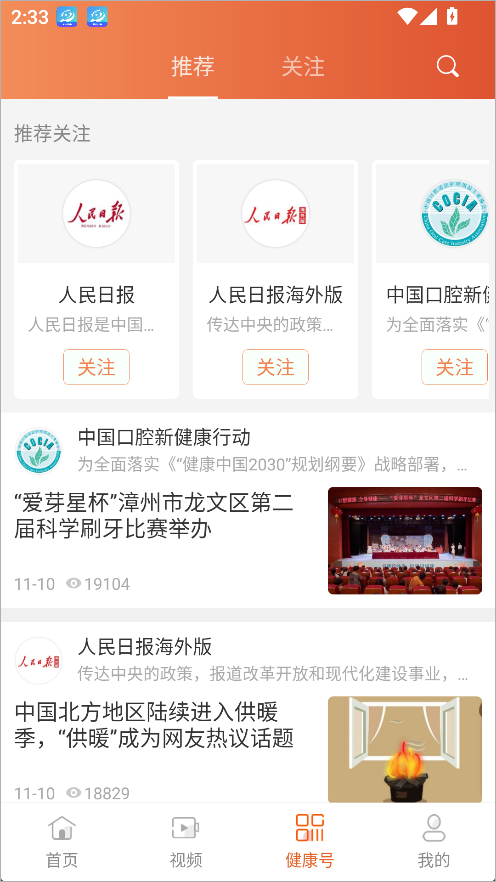 “健康号”是人民健康App的专业内容聚合平台,入驻了全国医疗机构、行业专家及专业媒体账号。