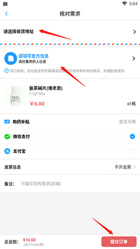 4、选择收货地址,完善用药人信息,然后点击“提交订单”选项付款即可。